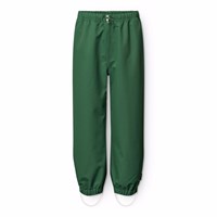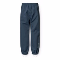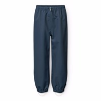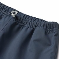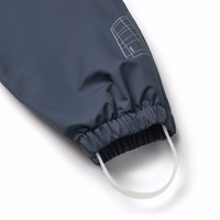 Dark blue wind- and waterproof rain trousers in durable and recycled polyester. The trousers have a regular fit, an adjustable elastic waistband, removable and adjustable rubber straps with the Molo logo, and a reflector at the bottom of the leg. The seams are waterproof, ensuring that wind and water are kept out.