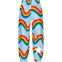 Light blue rain trousers in an all over print of wavy rainbows. The rain trousers are constructed in a lightweight, breathable quality that prevents condensation and moisture from forming on the inside of the trousers, even during high levels of activity. The rain trousers have an adjustable elastic waist and elastic at the legs. One of the trouser legs has a large star reflector on the back to make the child more visible in traffic. All the seams are taped to prevent water leaking in from the outside. Water column pressure: 5.000 mm. Breathability: 5.000 g/m2/24hrs.