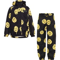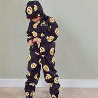 Whalley is a lightweight and functional rainwear set in black with a smiley face print. The rain jacket has a covered zip closure to protect against the wind and rain. It has taped seams, a detachable hood and two front pockets. The trousers have taped seams and adjustable elastic at the legs and waist. Both the rain jacket and the trousers have Molo's iconic star reflectors on the back. This rainwear set has a huge advantage in that it is breathable, so a high activity level won't make the trousers and jacket wet on the inside. This product has a water resistant, PFC-free surface treatment (Does not contain, e.g. PF OS, PFOA, etc). Water column pressure: 5.000 mm. breathable: 5.000 g/m2/24hr.