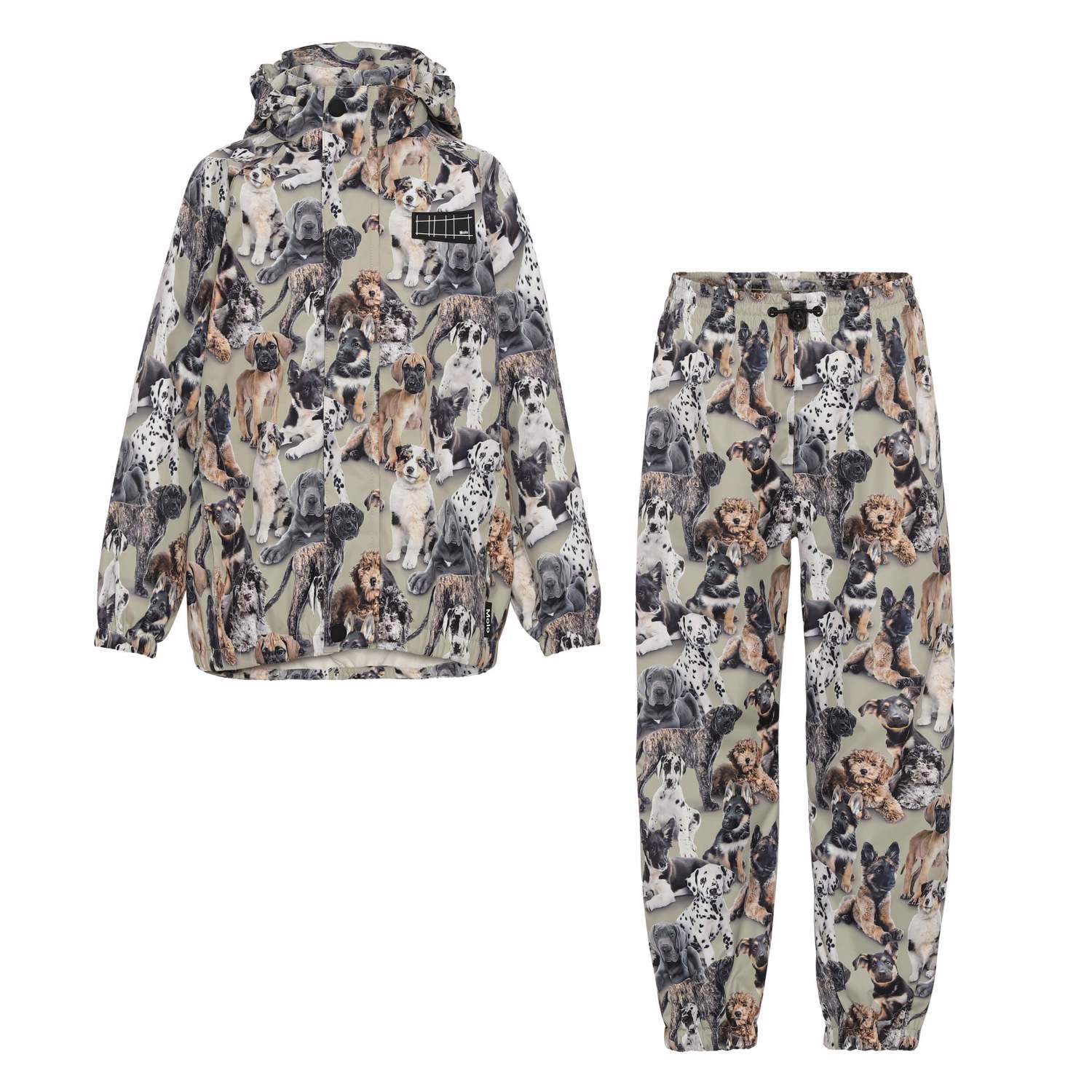 Whalley is a lightweight and functional rainwear set in khaki with a charming dog print. The rain jacket has a covered zip closure to protect against the wind and rain. It has taped seams, a detachable hood and two front pockets. The trousers have taped seams and adjustable elastic at the legs and waist. Both the rain jacket and the trousers have Molo's iconic star reflectors on the back. This rainwear set has a huge advantage in that it is breathable, so a high activity level won't make the trousers and jacket wet on the inside. This product has a water resistant, PFC-free surface treatment (Does not contain, e.g. PF OS, PFOA, etc). Water column pressure: 5.000 mm. breathable: 5.000 g/m2/24hr.