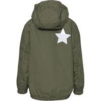 Whalley is a lightweight, functional rainwear set in khaki green. The jacket has a covered zipper to protect against wind and rain, taped seams, detachable hood and two front pockets. The trousers have elastic at the waist and legs. Both the jacket and the trousers have Molo's iconic star reflector on the back. This rainwear set has a water resistant, PFC-free surface treatment (Does not contain,e.g. PFOS, PFOA, etc). Water column pressure: 5.000 mm. breathable: 5.000 g/m2/24hr.