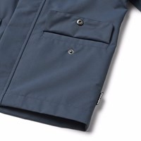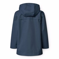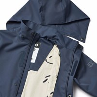 Dark blue wind- and waterproof jacket in recycled polyester with a detachable hood. The jacket has a regular fit, front pockets with button closure, adjustable snap buttons at the wrists, waterproof seams, and a zipper with a flap to keep out the weather. The lining is in soft cotton with an all-over print of smiling faces. The jacket's technical features make it suitable as a raincoat.