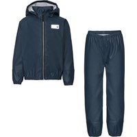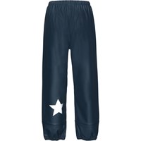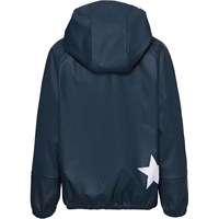 Zet is a dark blue rainwear set. It has a detachable hood and zip closure on the front. The trousers have elastic at the waist and legs. Both the jacket and trousers have Molo's iconic star reflectors on the back. This product has a water resistant, PFC-free surface treatment (Does not contain,e.g. PFOS, PFOA, etc). Water column pressure: 8.000 mm. Parts of this Molo product are recycled because it is constructed in 50% reusable polyester. The recycled polyester is made of used plastic bottles and other waste materials. The production of reusable polyester uses less resources and emits less CO2, making Molo’s rainwear the sustainable choice.