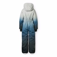 Wind and waterproof jumpsuit in blue gradient colors for a cold winter or ski holiday in recycled polyester. The suit has a detachable lined hood with an extra elastic edge that keeps it in place on the head, as well as a zipper on the front with a flap that keeps wind and water out. The jumpsuit has elastic at the waist and wind and snow cuffs at the sleeves and leg openings to keep snow, rain, and wind out. In addition, the suit has extra adjustment at the leg opening and uses a durable material on the inside. This ensures that the suit fits perfectly over ski boots or winter boots and also extends the lifespan. The suit is equipped with a reflective text on the leg, ensuring visibility in traffic. Furthermore, the suit is lined with recycled polyester fleece in exposed areas and padded with 3M™ Thinsulate™, which helps retain heat. The suit has front pockets, an inner pocket, and a small pocket on the sleeve for a lift pass, all with waterproof zippers.