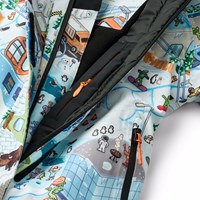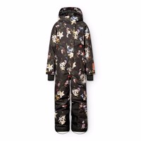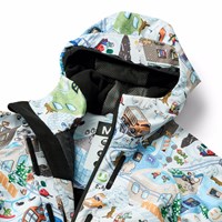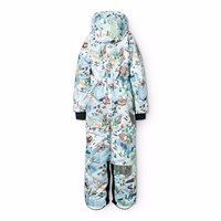 Wind and waterproof jumpsuit with a pixelated print of the real world, fun characters from Molo's collections made from recycled polyester. The jumpsuit has a detachable lined hood with an extra elastic edge that keeps it in place on the head, as well as a front zipper with a flap that keeps wind and water out. The jumpsuit has elastic at the waist and wind and snow cuffs at the sleeves and leg openings, keeping snow, rain, and wind out. In addition, the jumpsuit has extra adjustment at the leg opening and uses a durable material on the inside. This ensures that the jumpsuit fits perfectly over ski boots or winter boots and also extends the lifespan. The jumpsuit is equipped with a reflective text on the leg, ensuring visibility in traffic. Furthermore, the jumpsuit is lined with recycled polyester fleece in exposed areas and padded with 3M™ Thinsulate™, which helps retain heat. The jumpsuit has front pockets, an inner pocket, and a small pocket on the sleeve for a lift pass, all with waterproof zippers.