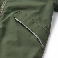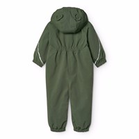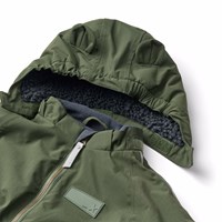 Water-repellent dark green snowsuit for the little ones made of recycled nylon. The snowsuit has a detachable, lined hood and an extra long zipper on the front making it easy to put on and take off. The elastic around the waist and around the sleeve and leg cuffs ensures that snow, rain and wind are kept out, while mittens and boots stay in place. The snowsuit has reflective bands on the pockets and sleeves to ensure extra visibility in traffic. Additionally, the snowsuit has fleece lining at the bottom and back, as well as an internally adjustable elastic around the waist, providing a snug and comfortable fit around the body.