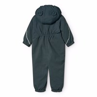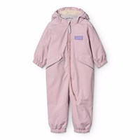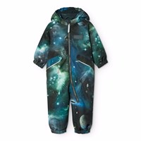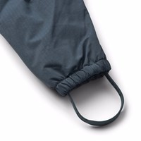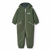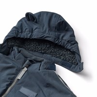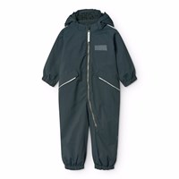 Water-repellent dark blue snowsuit for the little ones, made of recycled nylon. The suit has a detachable, lined hood and an extra long zipper on the front, making it easy to put on and take off. The elastic at the waist and at the sleeve and leg cuffs ensures that snow, rain, and wind are kept out, while mittens and boots stay in place. The snowsuit is equipped with reflective bands on the pockets and sleeves, ensuring extra visibility in traffic. Additionally, the suit has fleece lining at the seat and back, as well as internally adjustable elastic at the waist, providing a snug and comfortable fit around the body.