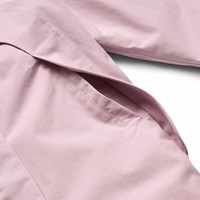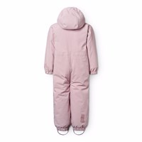 Water-repellent pink snowsuit, made of recycled nylon. The suit has a detachable lined hood and a long zipper on the front with flaps that make it easy to put on and take off. The elastic at the waist and at the sleeve and leg cuffs ensures that snow, rain, and wind are kept out, while mittens and boots stay in place. The snowsuit is equipped with a reflector on the leg, ensuring extra visibility in traffic. In addition, the suit has an internally adjustable elastic at the waist, providing a snug and comfortable fit around the body.