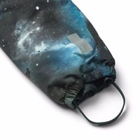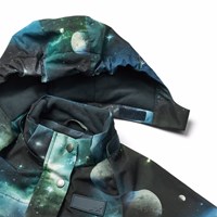 Water-repellent jumpsuit with space print, made of recycled polyester. The suit has a detachable lined hood and a long zipper on the front with flaps that make it easy to put on and take off. The elastic at the waist and at the sleeve and leg cuffs ensures that snow, rain, and wind are kept out, while mittens and boots stay in place. The jumpsuit is equipped with a reflector on the leg, ensuring extra visibility in traffic. Additionally, the suit has an internally adjustable elastic at the waist, providing a snug and comfortable fit around the body.