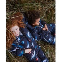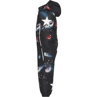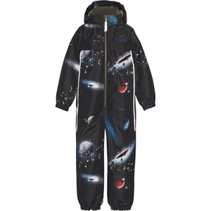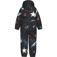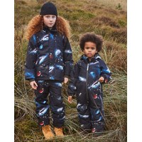 Unisex snowsuit that is perfect for everyday wear and active children. The snowsuit has many qualities like extremely high-water column pressure and breathability that keeps a child warm and dry in the cold months. The snowsuit is a part of Molo’s 'Outdoor Proof' collection, which is outerwear for more moderate winter weather. It lives up to Molo’s high standards for its outerwear with the same functional details and quality fabrics that Molo is known for. This snowsuit is, of course, also produced in responsibly recycled materials. This Pingo is in dark blue with a planet print.