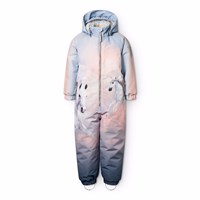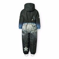 Water-repellent jumpsuit with a print of the man on the moon made of recycled polyester. The suit has zip pockets, a detachable lined hood with wind flap, and a long front zip that makes it easy to put on and take off. The elastic at the sleeve and leg cuffs ensures that snow, rain, and wind are kept out, while mittens and boots stay in place. The jumpsuit is equipped with a star reflector on the leg for extra visibility in traffic, and the internally adjustable waist elastic provides a snug and comfortable fit around the body.
