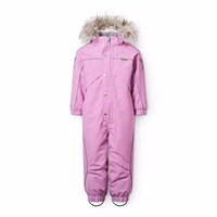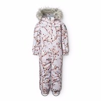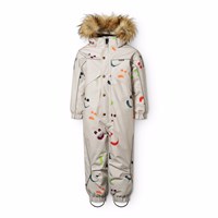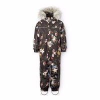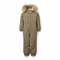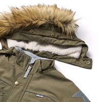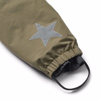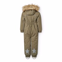 Wind and waterproof dark green snowsuit made of recycled nylon. The snowsuit has a detachable lined hood with a detachable faux fur trim, front pockets with wind flaps, front zippers with storm flaps and chin guard to prevent skin from getting caught. The snowsuit has internal elastic straps and elastic at the sleeve and leg openings to ensure it fits correctly and effectively keeps snow, rain, and wind out. The suit is equipped with reflective tape and two large stars on the legs for visibility in traffic. Furthermore, the jacket is lined with recycled polyester fleece in exposed areas and padded with 3M™ Thinsulate™, which helps retain heat.