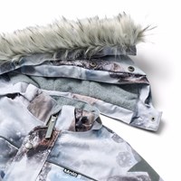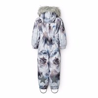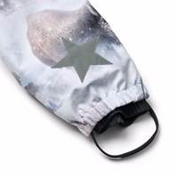Wind and waterproof snowsuit with a print of bison in a snow-covered landscape made of recycled polyester. The snowsuit has a detachable lined hood with a detachable faux fur trim, front pockets with wind flaps, front zippers with flaps, and chin guard to prevent skin from getting caught. The snowsuit has internal elastic straps and elastic at the sleeve and leg openings to ensure a proper fit and effectively keep snow, rain, and wind out. The suit is equipped with reflective tape and two large stars on the legs for visibility in traffic. Furthermore, the suit is lined with recycled polyester fleece in exposed areas and padded with 3M™ Thinsulate™ to help retain heat.
