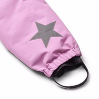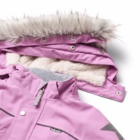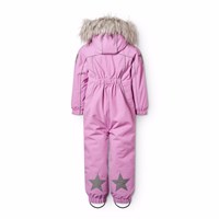 Wind and waterproof purple snowsuit made from recycled nylon. The snowsuit has a detachable lined hood with a detachable faux fur trim, front pockets with wind flaps, front zippers with storm flaps and chin guard to prevent skin from getting caught. The snowsuit has internal elastic straps and elastic at the sleeve and leg openings to ensure a proper fit and effectively keep snow, rain, and wind out. The suit is equipped with reflective tape and two large stars on the legs for visibility in traffic. Furthermore, the jacket is lined with recycled polyester fleece in exposed areas and padded with 3M™ Thinsulate™ to help retain heat.