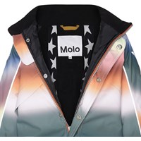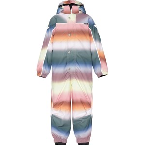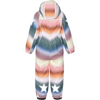 Polaris Fur is on of Molo's favourites for really cold weather. Polaris is a functional snowsuit in a pastel rainbow print and with reflective piping. It is perfect for extremely cold days but also ordinary winter days. The high level of breathability helps regulate a child's body temperature so it does not become too cold or over heated. On warmer winter days, a child can wear the jacket with a thin under layer, but on extremely cold days, you can add an extra layer underneath. Polaris is also a good choice for less active moments. The snowsuit has reflector piping and a faux fur trim that is detachable. Polaris has a detachable hood, a covered front zip closure and Molo's iconic star reflectors on the sleeves and legs. It has snow flaps at the legs and rubber stirrups. Polaris, in addition to all its other qualities, is now made from partially recycled materials. The outer fabric is made from 45% recycled polyester, the 3M™ Thinsulate™ padding from 83% recycled polyester and the lining from 100% recycled polyester. The snowsuit is windproof, waterproof and breathable and has taped seams. This product has a water-resistant, PFC-free surface treatment (Does not contain, e.g. PFOS, PFOA, etc). Because of this, it has received Best-in-Test status. The water column pressure and breathability have been imporved and are now up to 15.000 mm column pressure and breathability at 15.000 g/m2/24hr.
