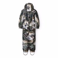 Wind and waterproof jumpsuit with dinosaur print made of recycled polyester. The jumpsuit has a detachable hood with fleece, front pockets with wind flaps, front zippers with flaps, and chin guard to prevent skin from getting caught. The jumpsuit has internal elastic straps and elastic at the sleeve and leg openings to ensure a proper fit and effectively keep snow, rain, and wind out. The suit is equipped with reflective bands and two large stars on the legs for visibility in traffic. Furthermore, the jacket is lined with recycled polyester fleece, 3M™ Thinsulate™, which helps retain heat.