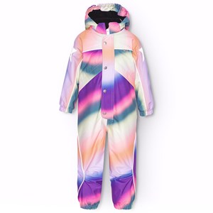 Snowsuit in recycled polyester for a cold winter with a multicoloured overflowing graffiti print. The snowsuit has a detachable lined hood and zips with flaps to keep wind and water out. It has elastic at the waist, sleeves, and legs to keep snow, rain, and wind out. The snowsuit is equipped with reflectors along the side seams, around the hood, and large star-shaped reflectors on both the sleeves and legs to increase visibility in traffic. The snowsuit is lined with 3M™ Thinsulate™, making it lightweight and providing greater mobility for the child. There are also lined front pockets with waterproof zippers. Features: Windproof, waterproof, and breathable. Water column pressure: 20,000 mm. Breathability: 20,000 g/m2/24h. Waterproof seams. 3M™ Thinsulate™ insulation. PFC-free (PFOS and PFOA). Reflective edges and reflectors on legs and arms to increase visibility in traffic. Detachable hood. Internal fleece lining at knees, bottom, and back for extra insulation in vulnerable areas. Snow gaiter at leg opening and detachable rubber boot strap. Fleece lining in pockets.