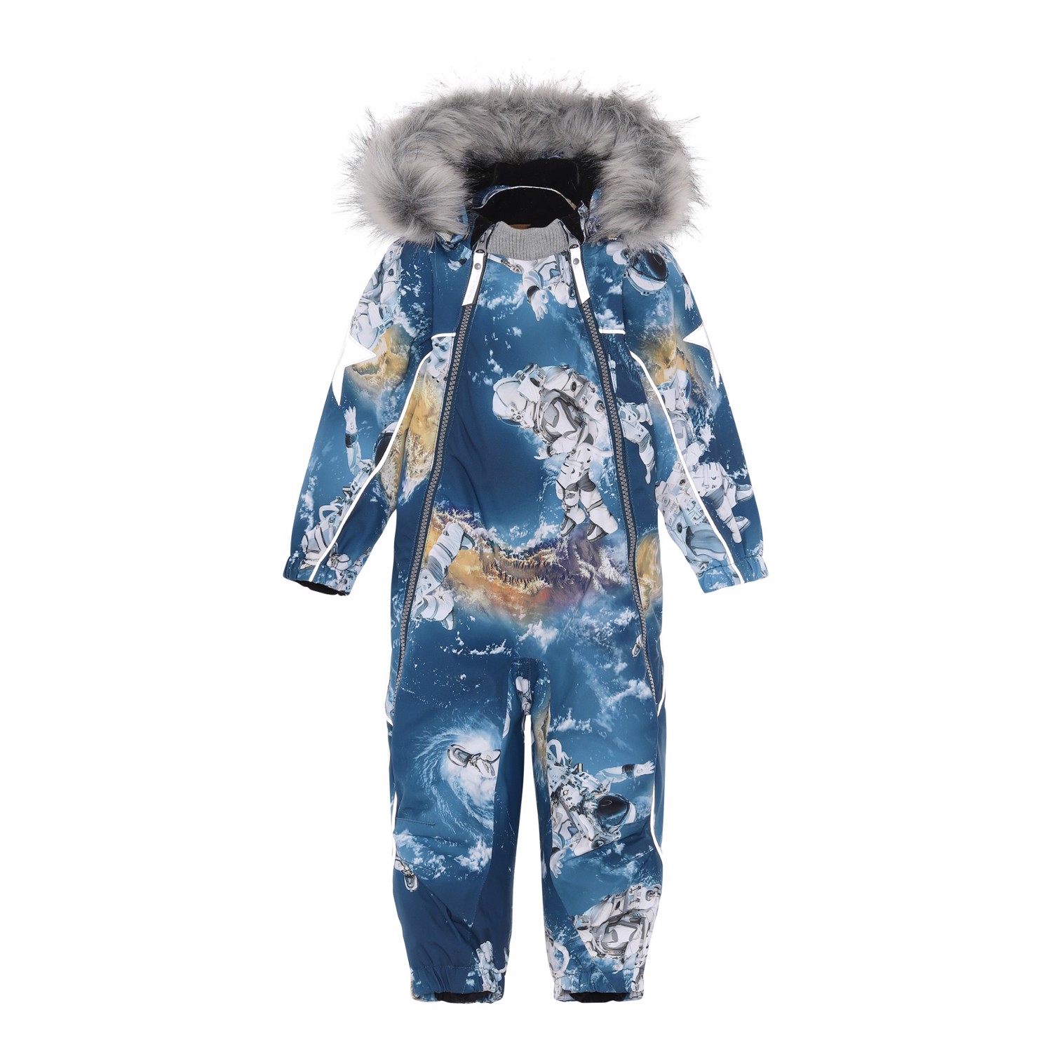 Pyxis is a functional snowsuit for babies and small children in blue with an astronaut print. Pyxis is perfect for extremely cold days but also ordinary winter days. The high level of breathability helps regulate a child's body temperature so it does not become too cold or overheated. On warmer winter days, a child can wear the jacket with a thin underlayer, but on extremely cold days, you can add an extra layer underneath. Pyxsis is also a good choice for less active moments. It has a detachable hood, two slanted zippers for easy dressing, snow flaps at the legs and rubber stirrups. Pyxis has Molo's iconic star reflectors on the upper arms and on the back of the legs. The snowsuit is windproof, waterproof and breathable. The outer fabric is made from 45% recycled polyester, the 3M™ Thinsulate™ padding from 83% recycled polyester and the lining from 100% recycled nylon. The snowsuit has taped seams. This product has a water-resistant, PFC-free surface treatment (Does not contain, e.g. PFOS, PFOA, etc). Water column pressure: 15.000 mm. Breathable: 15.000 g/m2/24hr.