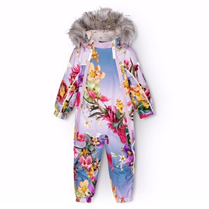 Snowsuit in recycled polyester for a cold winter with a print of beautiful flowers in fresh colours on a background of blue and purple shades. The snowsuit has a detachable hood with fleece, two zippers with fleece-lined chin guard to prevent the skin from getting caught. The snowsuit has an inner wind flap and elastic at the waist, sleeve, and leg openings to keep snow, rain, and wind out. The suit has reflectors along the side seams, around the hood, and large star-shaped reflectors on both sleeves and legs to increase visibility in traffic. The suit is lined with 3M™ Thinsulate™, which is lightweight and provides greater mobility for the child. Features: Windproof, waterproof, and breathable. Water column pressure: 20,000 mm. Breathability: 20,000 g/m2/24h. Waterproof seams. 3M™ Thinsulate™ insulation. PFC-free (PFOS and PFOA). Reflective edges and reflectors on legs and arms to increase visibility in traffic. 2 x zipper closure for easy and quick dressing. Detachable hood, lined with fleece and a removable faux fur trim. Internal fleece lining at knees, bottom, and back for extra insulation in vulnerable areas. Snow gaiter at leg opening and detachable rubber boot strap. Fleece lining in pockets.