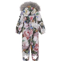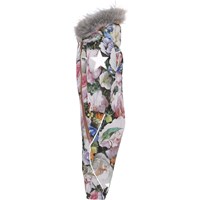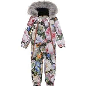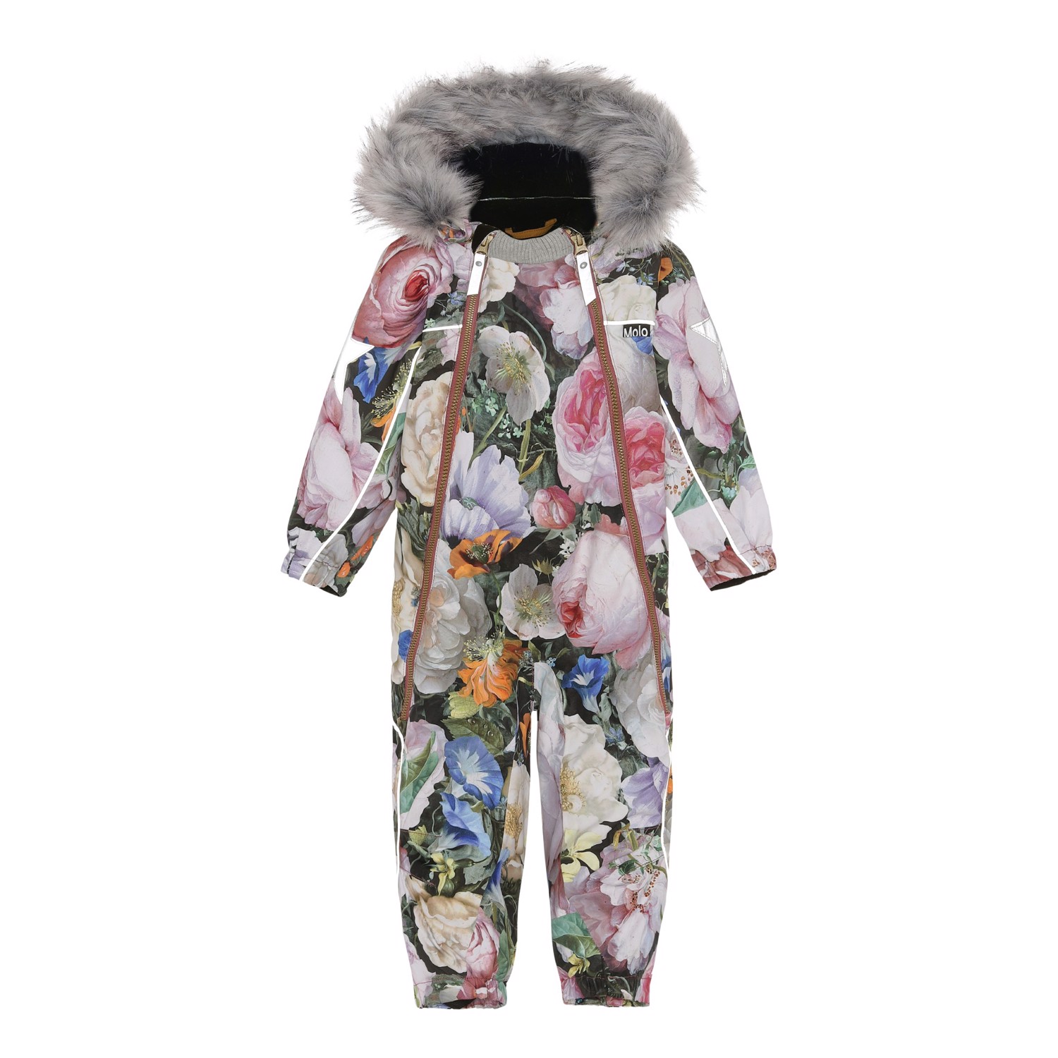 Pyxis is a functional snowsuit in a large floral print for babies and small children. Pyxis is perfect for extremely cold days but also ordinary winter days. The high level of breathability helps regulate a child's body temperature so it does not become too cold or overheated. On warmer winter days, a child can wear the jacket with a thin underlayer, but on extremely cold days, you can add an extra layer underneath. Pyxsis is also a good choice for less active moments. It has a detachable hood, two slanted zippers for easy dressing, snow flaps at the legs and rubber stirrups. Pyxis has Molo's iconic star reflectors on the upper arms and on the back of the legs. The snowsuit is windproof, waterproof and breathable. The outer fabric is made from 45% recycled polyester, the 3M™ Thinsulate™ padding from 83% recycled polyester and the lining from 100% recycled nylon. The snowsuit has taped seams. This product has a water-resistant, PFC-free surface treatment (Does not contain, e.g. PFOS, PFOA, etc). Water column pressure: 15.000 mm. Breathable: 15.000 g/m2/24hr.