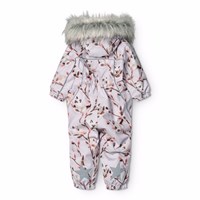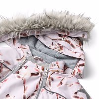 Purple wind and waterproof snowsuit for a cold winter with a print of beautiful gosling branches and white kitten made in recycled polyester. The snowsuit has a detachable lined hood with a detachable faux fur trim, two zippers on the front, as well as rib chin guard to prevent the skin from getting caught. The snowsuit has an inner wind flap and elastic at the waist, sleeve and leg cuffs to keep out snow, rain, and wind. The suit is equipped with reflective tape along the side seams, around the hood, and two large stars on the legs, ensuring visibility in traffic. Furthermore, the jacket is lined with recycled polyester fleece, 3M™ Thinsulate™, which helps retain heat.