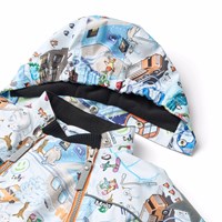 Wind and waterproof snowsuit for a cold winter made of recycled polyester, with a pixelated print of the real world, fun characters from Molo's collections. The snowsuit has a detachable hood with fleece, two zippers on the front, as well as rib chin guard to prevent skin from getting caught. The snowsuit has an internal wind flap and elastic at the waist, sleeve, and leg cuffs to keep out snow, rain, and wind. The suit is equipped with reflective tape along the side seams, around the hood, and two large stars on the legs, ensuring visibility in traffic. Furthermore, the jacket is lined with recycled polyester fleece, 3M™ Thinsulate™, which helps retain heat.
