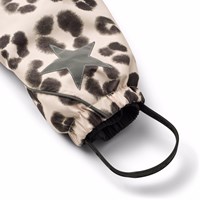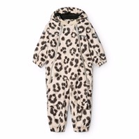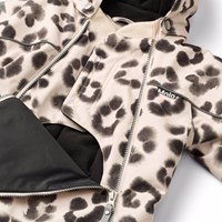 Wind and waterproof snowsuit for a cold winter in a unique leopard print made from recycled polyester. The snowsuit has a detachable hood with fleece, two zippers on the front, as well as rib chin guard to prevent skin from getting caught. The snowsuit has an internal wind flap and elastic at the waist, sleeve, and leg cuffs to keep out snow, rain, and wind. The suit is equipped with reflective tape along the side seams, around the hood, and two large stars on the legs, ensuring visibility in traffic. Furthermore, the jacket is lined with recycled polyester fleece, 3M™ Thinsulate™, which helps retain heat.