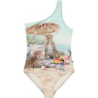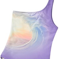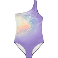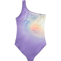 One-shoulder swimsuit in recycled polyester with UV protection 50+. The swimsuit has a regular fit, asymmetrical wide strap, and is fully lined. It is purple with a print of sea foam and a sunrise. The product is CE-marked and tested according to standard EN-13758-1.