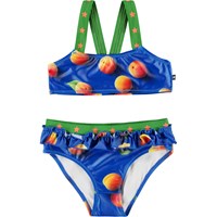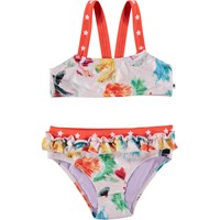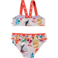 Pink bikini with a print of colourful veiltail fish. It is made of 85% recycled polyester. The bikini top has orange-red straps with white stars. The bottoms have a small ruffle under the elastic waist that matches the design on the straps. Molo's swimwear has 50+ UV protection. The product is CE-marked and tested according to standard EN-13758-1.