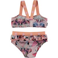 Lovely bikini with a digital bird print, ruffle details at the bottoms, a black waistband and straps with printed Molo stars. The straps are fastened at the middle of the back. The elastic fabric allows for easy movement. This product has a UV protection of 50+.