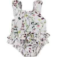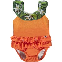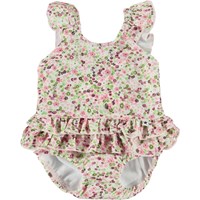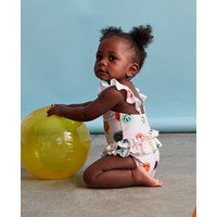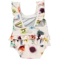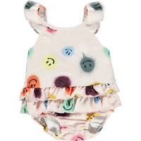 Nalani is a baby swimsuit with ruffles at the waist and on the straps. This Nalani is in rose with colourful smiley faces. Molo's swimwear has 50+ UV protection. The product is CE-marked and tested according to standard EN-13758-1.