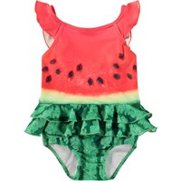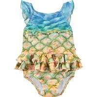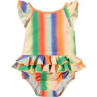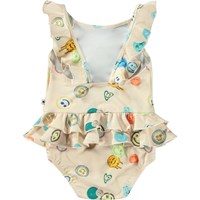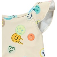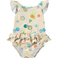 Swimsuit for the little ones in recycled polyester with UV protection 50+. The swimsuit has decorative ruffle details, a deep back, elastic around the thighs, and a lined bottom with room for a nappy. The swimsuits is beige with an all-over print of colourful, smiling faces. The product is CE-marked and tested according to standard EN-13758-1.