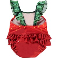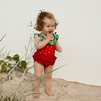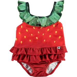 Nalani is a red baby swimsuit with ruffles at the waist and on the straps. This Nalani has a strawberry print. Molo's swimwear has a UV protection of 50+. The product is CE-marked and tested according to standard EN-13758-1.