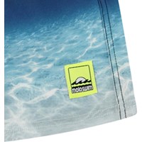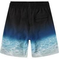 Knee-length swim shorts for active children in recycled polyester with UV protection 50+. The shorts have a loose fit, side pockets, back pocket, wide elastic waistband with drawstring, and inner shorts in soft mesh. The shorts are black with a print of a clear blue seabed. The product is CE-marked and tested according to standard EN-13758-1.