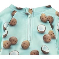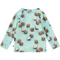 Rashguard for the little ones made from recycled polyester with UV protection 50+. The shirt has a snug fit, a stand-up collar, a zip closure at the back for easy on and off, and long raglan sleeves to protect against the sun's rays. The rashguard is light blue with an all-over print of fresh coconuts. The product is CE-marked and tested according to standard EN-13758-1.