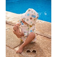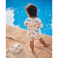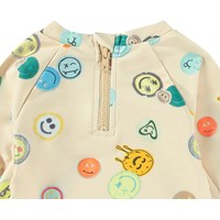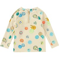 Rashguard for the little ones made from recycled polyester with UV protection 50+. The shirt has a snug fit, a stand-up collar, a zip closure at the back for easy on and off, and long raglan sleeves to protect against the sun's rays. The rashguard is beige with an all-over print of colourful, smiling faces. The product is CE-marked and tested according to standard EN-13758-1.