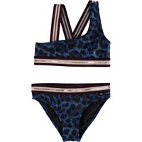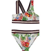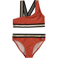Nicola is a sporty, asymmetrical bikini in a beautiful graphic palm tree print with gold details. The bikini has wide striped straps and an edge tape in gold, red and green. The top has crossed straps on the back. Molo's swimwear has a UV protection of 50+.
