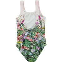 Light coloured swimsuit with a round neck, deep back and a placement print on the front and back of galloping horses in a wildflower meadow. The suit is constructed in recycled, stretchy polyester, which makes it easy to slip on and off. It offers a high level of 50+ UV protection from the sun. The product is CE-marked and tested according to standard EN-13758-1.