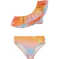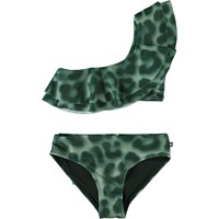 Nikki is an asymmetrical bikini in blue with a tie-dye print. The bikini top has an all-around ruffle edge in two layers, which creates a lovely wave effect. Nikki has a good fit with good coverage. Molo's swimwear has 50+ UV protection. The product is CE-marked and tested according to standard EN-13758-1.