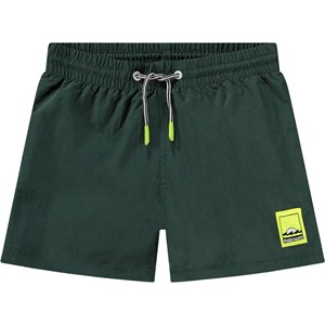 Sporty dark green swim shorts for active children in recycled nylon with UV protection 50+. The shorts have a loose fit, reach mid-thigh, feature a simple back pocket, elastic waistband with drawstring, and soft mesh inner shorts. The product is CE-marked and tested according to standard EN-13758-1.