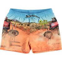 It is all about exploration and adventure in the outback on the Niko swim trunks in the 'In the Bush' print with three curious dogs in the back of a car. They have an elastic waist with ties to make sure they are easy to move around in. Molo's swimwear has 50+ UV protection. The product is CE-marked and tested according to standard EN-13758-1.