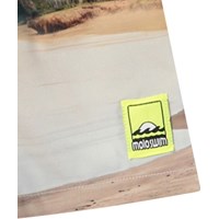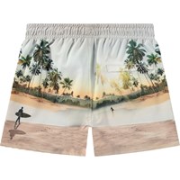 Sporty swim shorts for active children in recycled polyester with UV protection 50+. The swim shorts have a loose fit, reach mid-thigh, have a simple back pocket, elastic waistband with drawstring, and soft mesh inner shorts. The swim shorts are light-coloured with a print of a beach, palm trees, and surfers. The product is CE-marked and tested according to standard EN-13758-1.