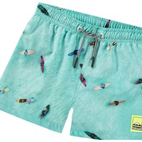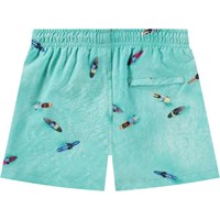 Sporty swim shorts for active children in recycled polyester with UV protection 50+. The swim shorts have a loose fit, reach mid-thigh, have a simple back pocket, elastic waistband with drawstring, and soft mesh inner shorts. The swim shorts are turquoise blue with an aerial photo print of a surfer on the water. The product is CE-marked and tested according to standard EN-13758-1.