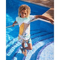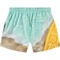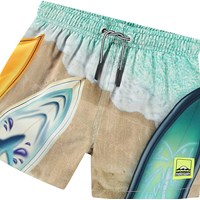 Sporty swim shorts for active children in recycled polyester with UV protection 50+. The swim shorts have a loose fit, reach mid-thigh, have a simple back pocket, elastic waistband with drawstring, and soft mesh inner shorts. The swim shorts have a print of surfboards on a beautiful sandy beach. The product is CE-marked and tested according to standard EN-13758-1.