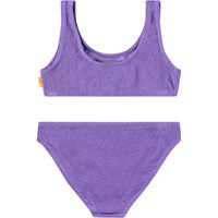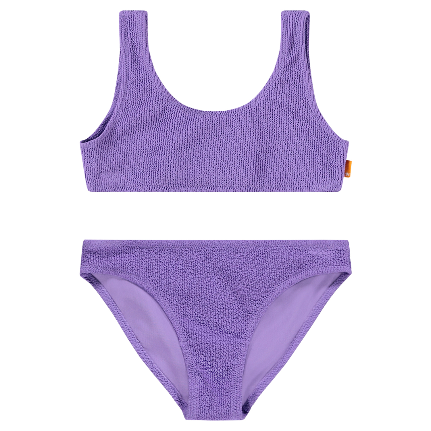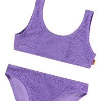 Stretchable purple bikini in textured pattern with UV protection 50+. The bikini has a wide top, wide straps, deep back, and is fully lined. The bottom has an elastic waistband, a regular fit, and is fully lined. The product is CE-marked and tested according to standard EN-13758-1.